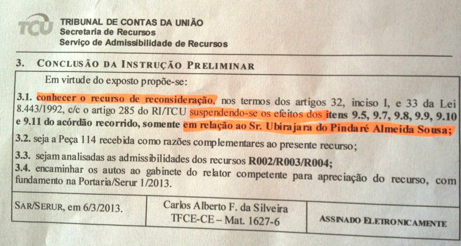 existe condenação definitiva pelo TCU. Isto porque ainda há recurso pendente de