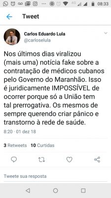 O secretário estadual de Saúde, Carlos Lula, usou as rede sociais para rebater notícia falsa sobre suposta contratação de médicos cubanos pelo Governo do Maranhão. Lula lamentou que estejam usando a internet para propagar as chamadas fake news e tentar tumultuar o setor.