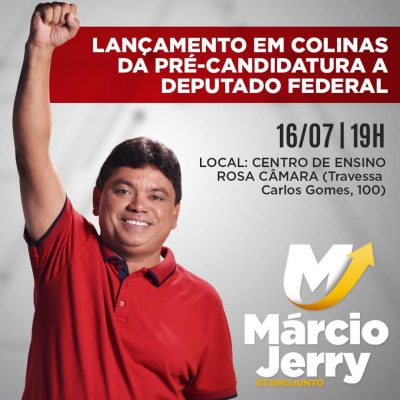 Colina – Na cidade natal, Colinas, Márcio Jerry fará mais um lançamento da pré-candidatura, na segunda-feira (16). O grande ato, reunindo lideranças, apoiadores e amigos do médio sertão, será realizado no Centro de Ensino Rosa Câmara (Travessa Carlos Gomes, 100).