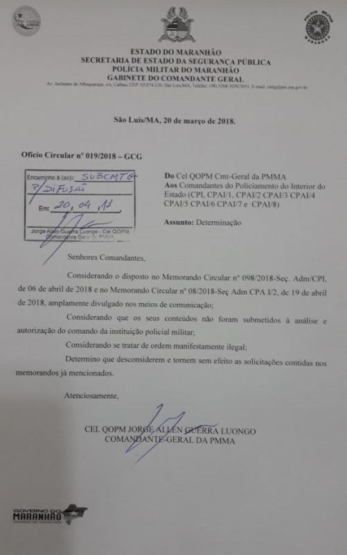 O Comandante da Polícia Militar do Maranhão, Cel. Jorge Luongo, informou, por meio de nota, que o comunicado feito pelo Comando do Policiamento de Barra do Corda, determinando o “fichamento” de adversários políticos do governo no interior do estado, é um equívoco grave e sem precedentes, não autorizado pelo Comando da PM.