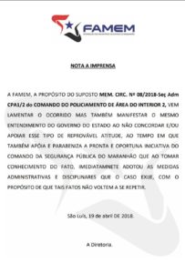 A Federação dos Municípios do Estado do Maranhão (Famem) emitiu nota oficial parabenizando a reação da Secretaria de Segurança Pública aos documentos ilegais e sem conhecimento do Comando da Polícia Militar tratando de suposta determinação a Unidades do Interior sobre identificação de lideranças políticas. Esses documentos foram emitidos sem o conhecimento e a autorização do comando da Polícia Militar.