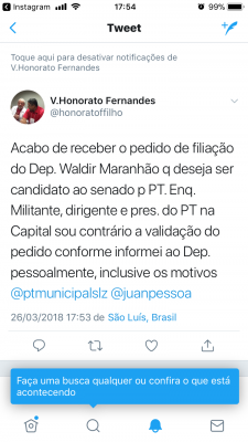 Após protocolar o pedido de filiação no diretório municilal do PT, em São Luís, o vereador Honorato Fernandes se manifestou contra o pedido.