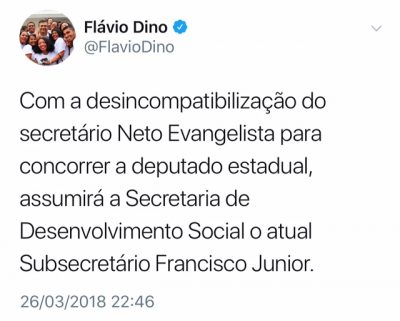 O governador Flávio Dino (PCdoB) voltou a usar sua rede social de internet para anunciar nova mexida no secretariado por conta da desincompatibilização de auxiliares que vão disputar mandato eletivo nas eleições de outubro próximo.