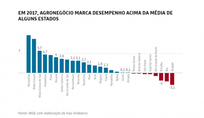 O estudo do Itaú Unibanco também mostra que o Sudeste foi a única região a ter queda do PIB em 2017, de 0,7%. O Sul liderou o crescimento, com alta de 3,4%. Em seguida, vêm Norte (2,6%), Centro-Oeste (2,4%) e Nordeste (1,7%). Ou seja, o desempenho do Maranhão também se destaca dentro da região Nordeste.