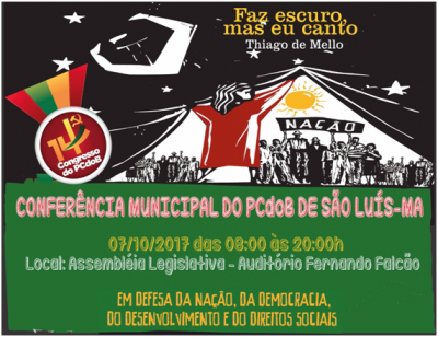 Com o tema “Em defesa da nação, da democracia, do desenvolvimento e dos direitos sociais”, a conferência municipal do PCdoB de São Luís será realizada no Auditório Fernando Falcão, na Assembleia Legislativa do Maranhão (AL-MA). Além de anteceder a 14ª Conferência Estadual do PCdoB no Maranhão, o evento municipal servirá como debate preparatório para o 14º Congresso Nacional do partido, a ser realizado entre os dias 17 e 19 de novembro, em Brasília.