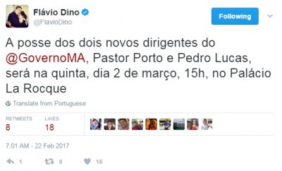 A informação foi confirmada pelo próprio governador Flávio Dino em seu twitter. Quem ocupará a cadeira de Pedro Lucas na Câmara Municipal de São Luís será o suplente Joãozinho Freiras (PTB).