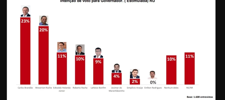 Conforme os núneros da pesuisa, Carlos Brandão tem 23% das intenções de votos, Weverton. 20% Edivaldo Holanda Júnior 11%, Roberto Rocha, 10%, Lahésio Bonfim, 9%, Josimar Maranhãozinho, 4%, Simplício Araújo, 2%, Enilton Rodrigues (não pontuou). Nenhum deles, 10% e Não Sabe/Não responde, 11%.