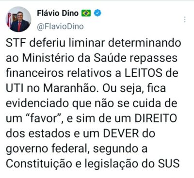 Para o governador Flávio Dino (PCdoB), a decisão liminar da ministra do Supremo Tribunal Federal, Rosa Weber, neste domingo (28), de determinar que o governo federal reative leitos de UTI para tratamento de Covid-19 nos estados do Maranhão, São Paulo e Bahia, fica evidenciado que não se trata de um favor e sim de dever do governo federal, segundo a Constituição e a legislação do Sistema Único de Saúde (SUS).