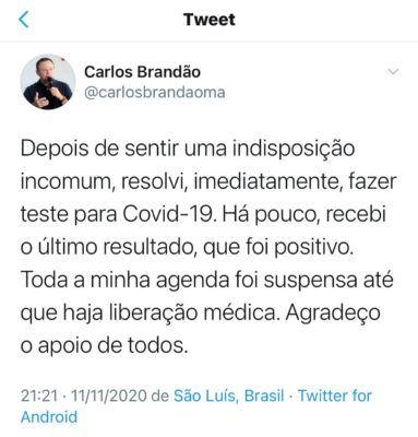 Brandão disse em sua página no Twitter que após sentir uma indisposição incomum resolveu fazer o teste para Covid-19 e que o exame constatou a presença do vírus em seu organismo, levando-o a suspender todos os seus compromissos.