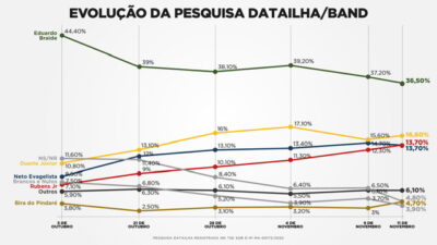 Nova pesquisa do instituto DataIlha/Band, divulgada na noite desta quarta-feira (11), mostra que a corrida pela Prefeitura de São Luís mantém a indefinição para a vaga no 2º turno, com um empate técnico entre Duarte Júnior (Republicanos), Neto Evangelista (Democratas) e Rubens Jr (PCdoB). Neto Evangelista e Rubens ficaram com porcentagens iguais com 3 pontos de diferença de Duarte Jr. O deputado Eduardo Braide (Podemos) continua na liderança.