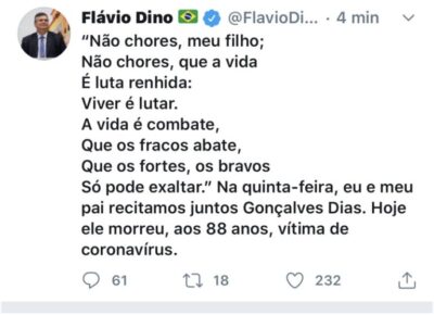 O governador Flávio Dino anunciou nesta manhã de segunda-feira, através das rede sociais, o falecimento do seu pai, o ex-deputado estadual Sálvio Dino (88 anos).