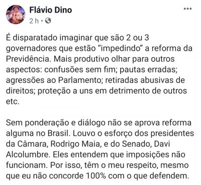 “É disparatado imaginar que são 2 ou 3 governadores que estão “impedindo” a reforma da Previdência. Mais produtivo olhar para outros aspectos: confusões sem fim; pautas erradas; agressões ao Parlamento; retiradas abusivas de direitos; proteção a uns em detrimento de outros etc”, observou disparou Dino.