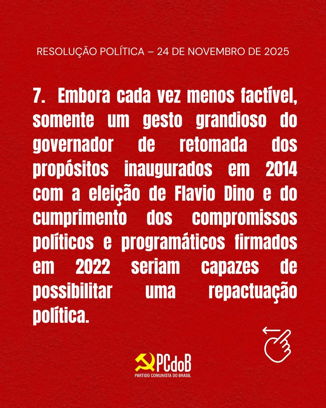 Apesar da dureza da nota, a direção estadual do PCdoB afirma que, “embora cada vez menos factível. somente um gesto grandioso do governador de retomada dos propósitos inaugurados em 2014 com a eleição de Flávio Dino e do cumprimento dos compromissos políticos e programáticos firmados em 2022 seriam capazes de possibilitar uma repactuação política”.