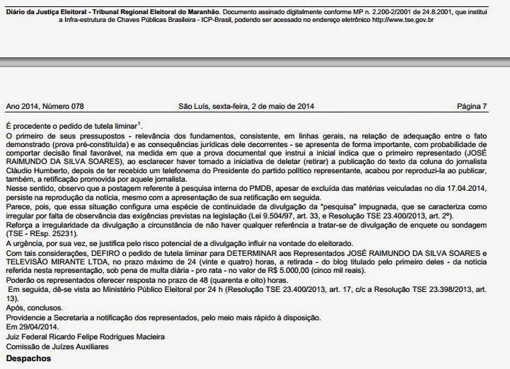 Justiça a divulgação em blog hospedado no Sistema Mirante de Comunicação, que