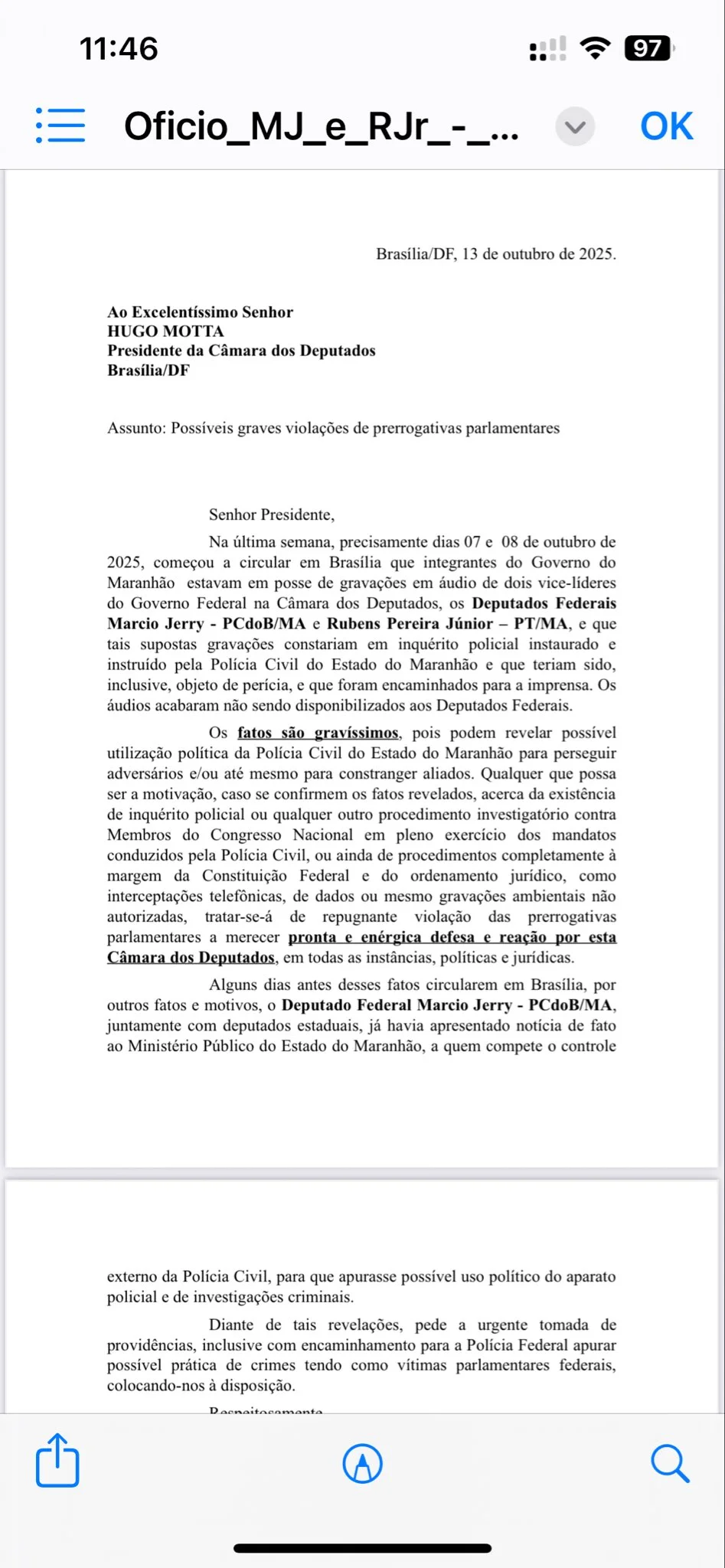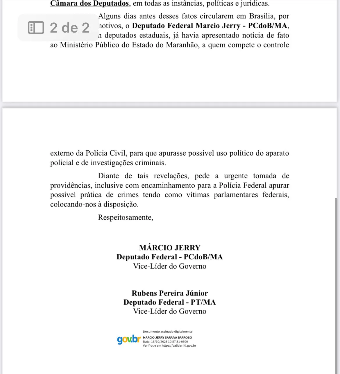 Os deputados federais Márcio Jerry (PCdoB-MA) e Rubens Pereira Júnior (PT-MA) encaminharam, nesta manhã de segunda-feira (13) uma representação ao presidente da Câmara dos Deputados, Hugo Motta (Republicanos-PB), solicitando que que Polícia Federal investigue suspeita de gravações ilegais envolvendo os dois parlamentares e o secretário executivo do Ministério do Esporte, Diego Galdino.