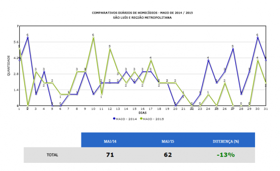homicídios dolosos no mês de maio deste ano teve queda de 13% quando comparado