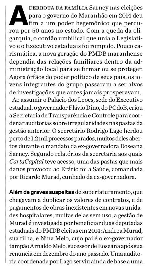 Sem mandato, praticamente aposentado, mas com algum poder ainda no PMDB, maior partido do país, o ex-presidente Sarney aposta na queda de Dilma e na ascensão do vice Michel Temer para voltar a ter um naco de poder e continua a perseguição aos seus adversários no Maranhão. Para decepção e desespero do ex-presidente, no entanto, a população não apoia a ideia de impeachment e até as entidades empresariais também já se mostram preocupadas com a tentativa de políticos sem escrúpulos em tentar tumultuar o governo aprovando propostas que podem deixar o país ingovernável.