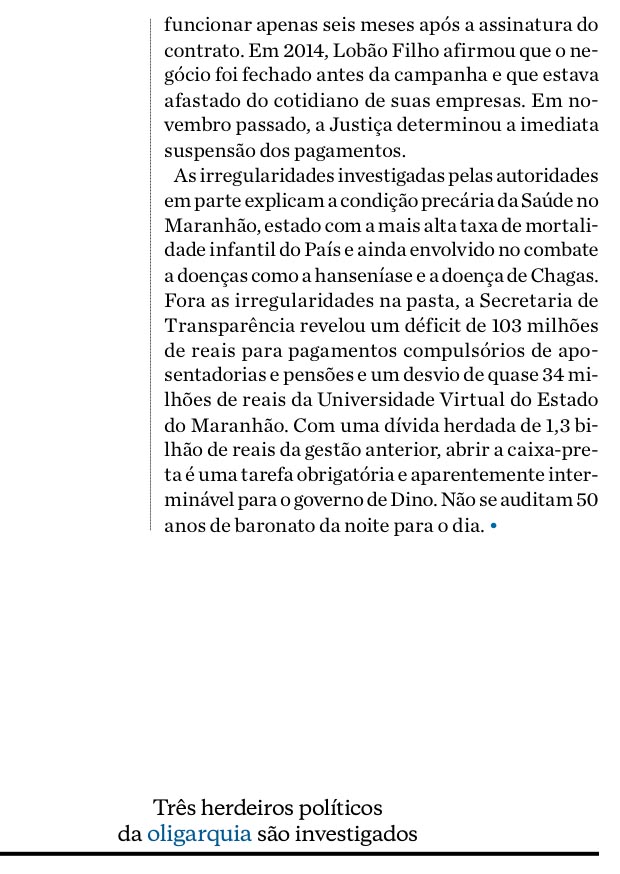 O ciclo de perseguição, que tanto penalizou a população maranhense, somente foi rompido com a derrota do grupo Sarney nas eleições de 2014, quando o eleitorado, após cinco décadas sendo massacrado e vendo os recursos do Estado escorrer pelo ralo da corrupção, pôs fim a última oligarquia remanescente do país e elegeu Flávio Dino, companheiro de luta da presidente e um dos seus principais auxiliares no comando da Embratur. Foi o primeiro governador a se levantar contra a cassação do mandato legítimo da presidente por políticos do tipo Sarney.